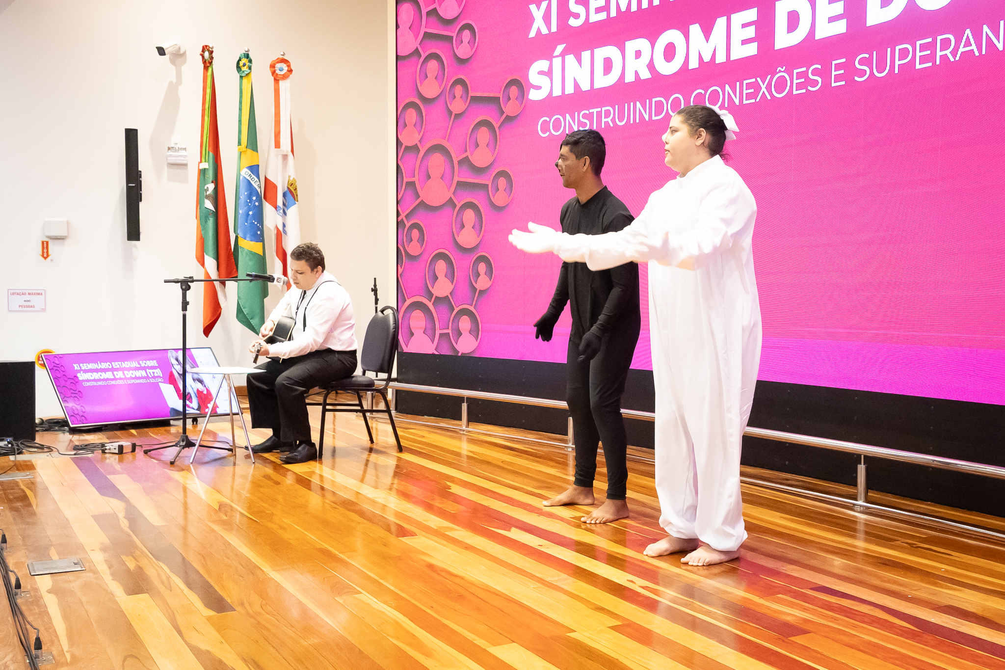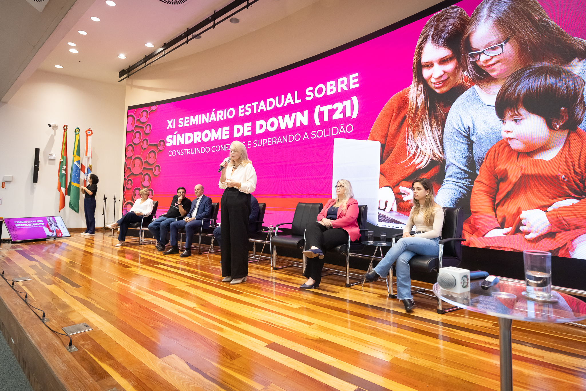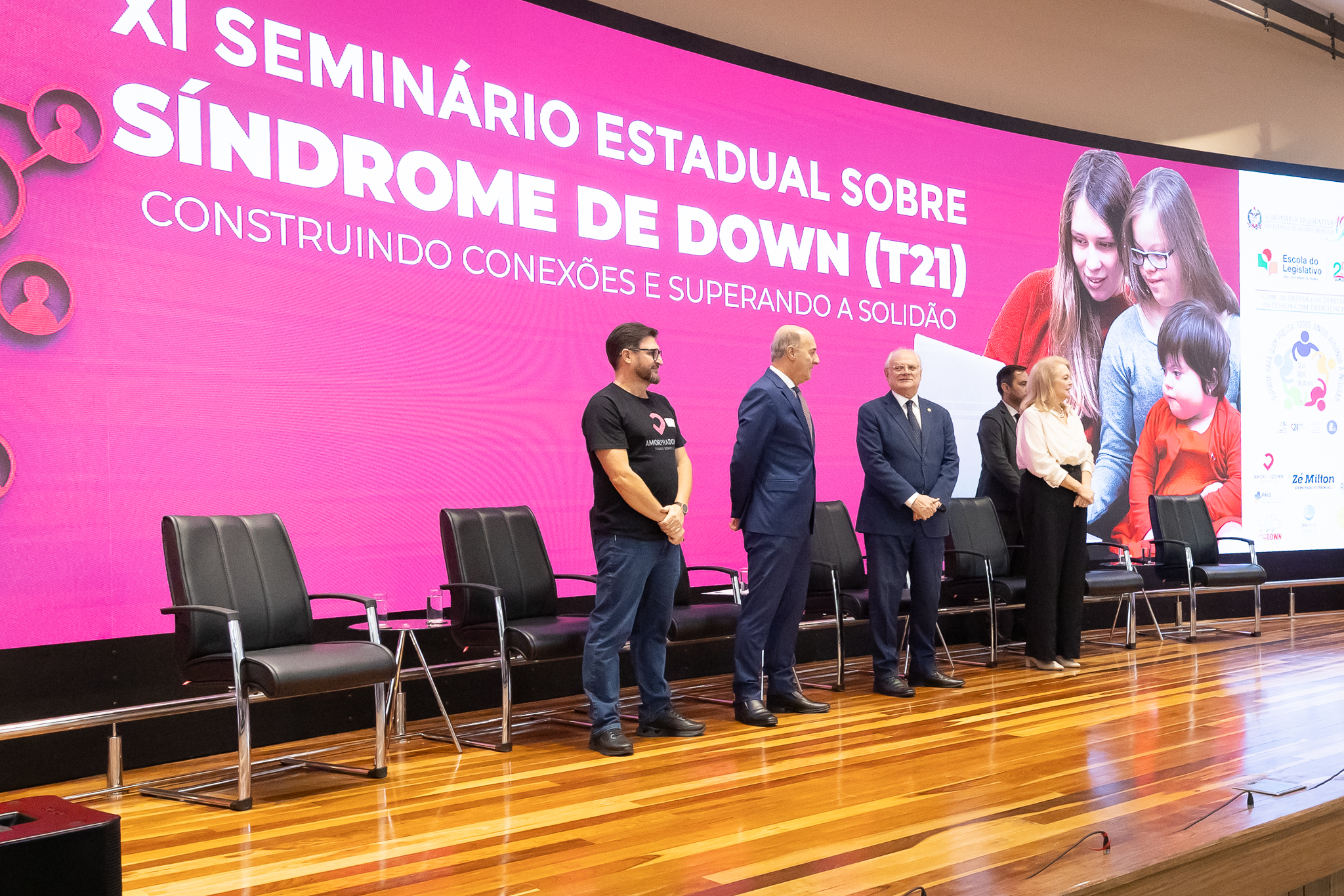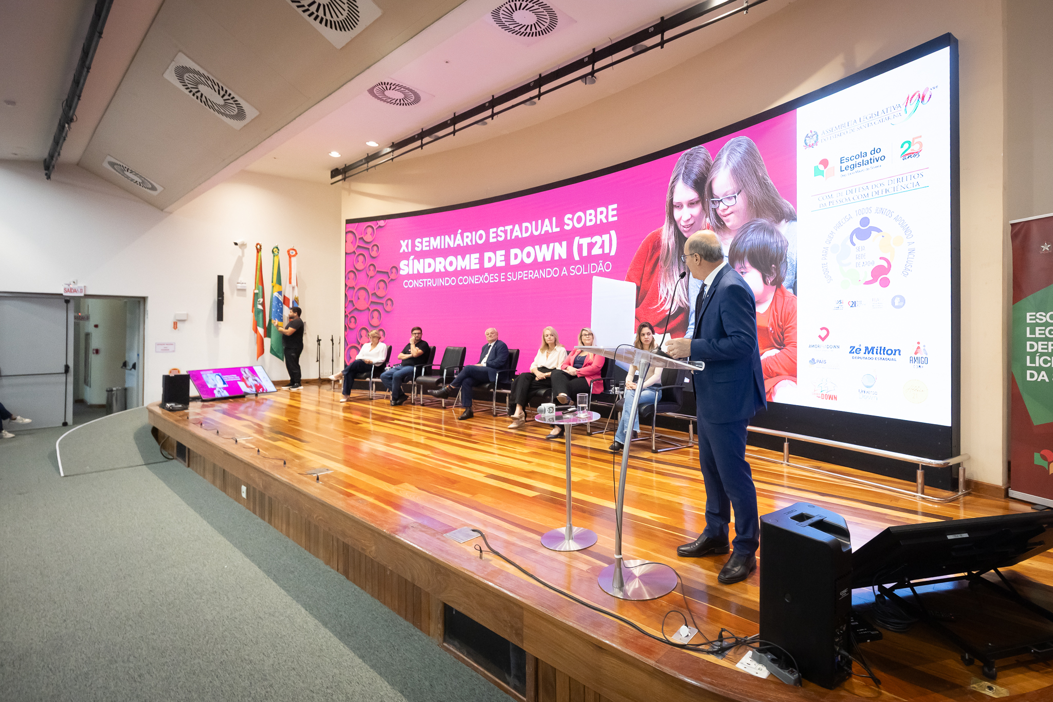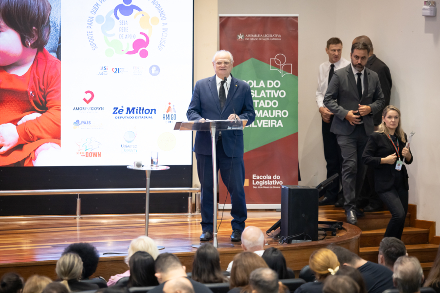 A solenidade de abertura contou com a presença do presidente da Comissão dos Direitos da Pessoa com Deficiência, deputado Dr. Vicente Caropreso (União Brasil); do deputado José Milton Scheffer (PP), proponente do seminário; da presidente da Federação Catarinense de Educação Especial, Jeane Rauh Probst Leite; do diretor de projetos das Associações de Síndrome de Down, Marco Antônio Costa; da representante da Secretaria de Estado da Saúde, Jaqueline Reginato; da vice-presidente da Federação das Apaes de Santa Catarina, Janice Krasniak; e da autodefensora das Apaes, Isabela Macedo de Ávila.