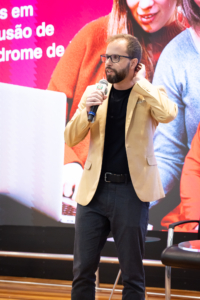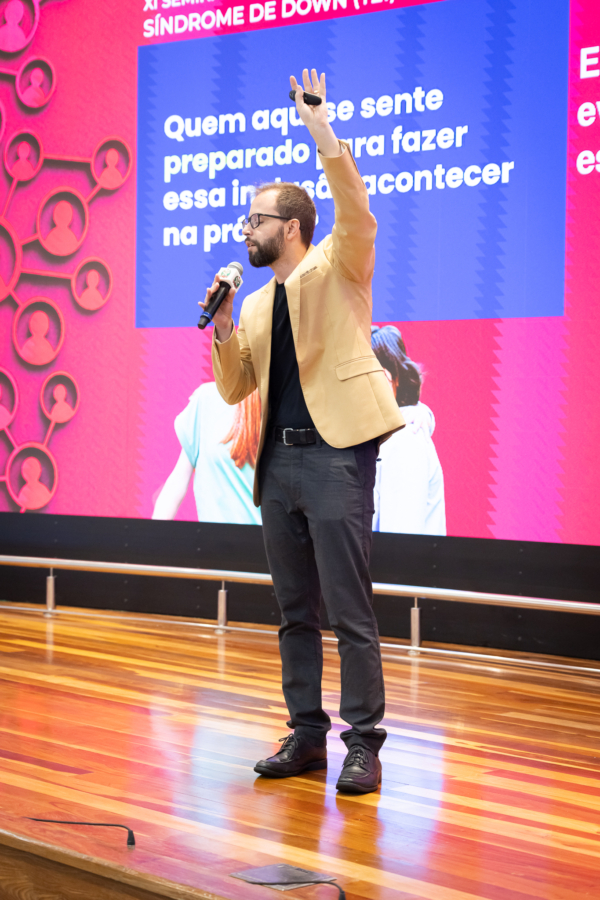 - palestrante Leandro Rodrigues, que conduziu o tema “Estratégias Baseadas em Evidências para a Inclusão de Estudantes com Síndrome de Down”.