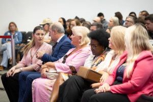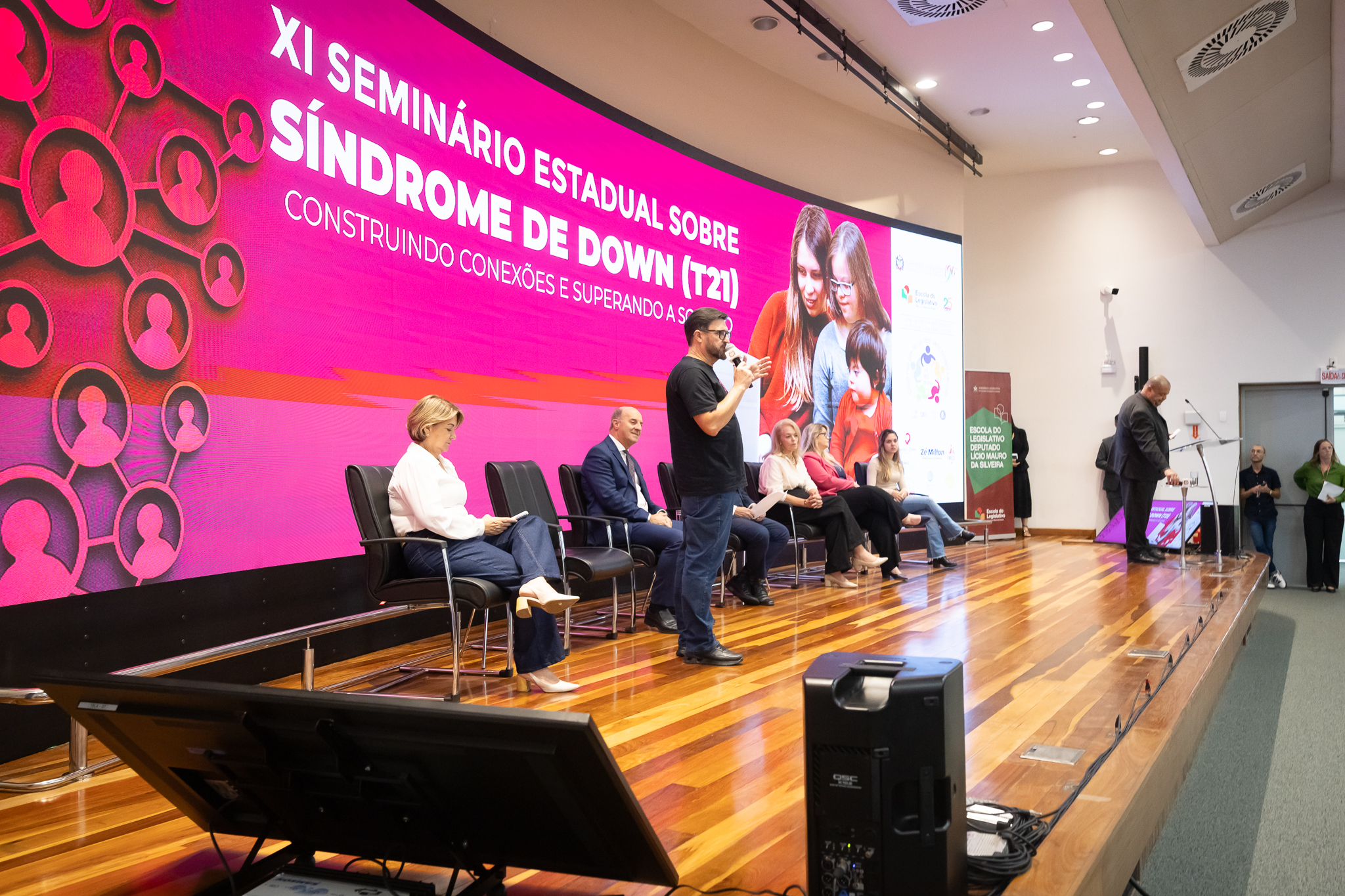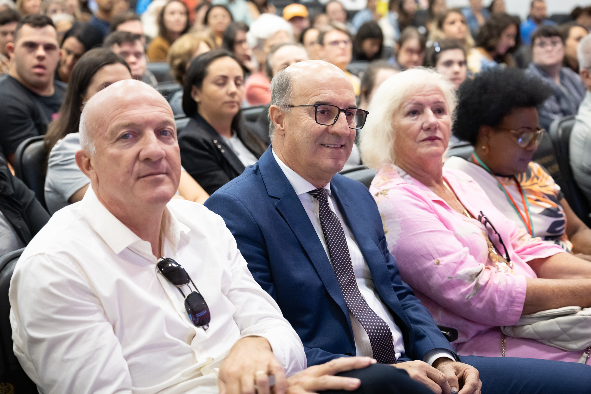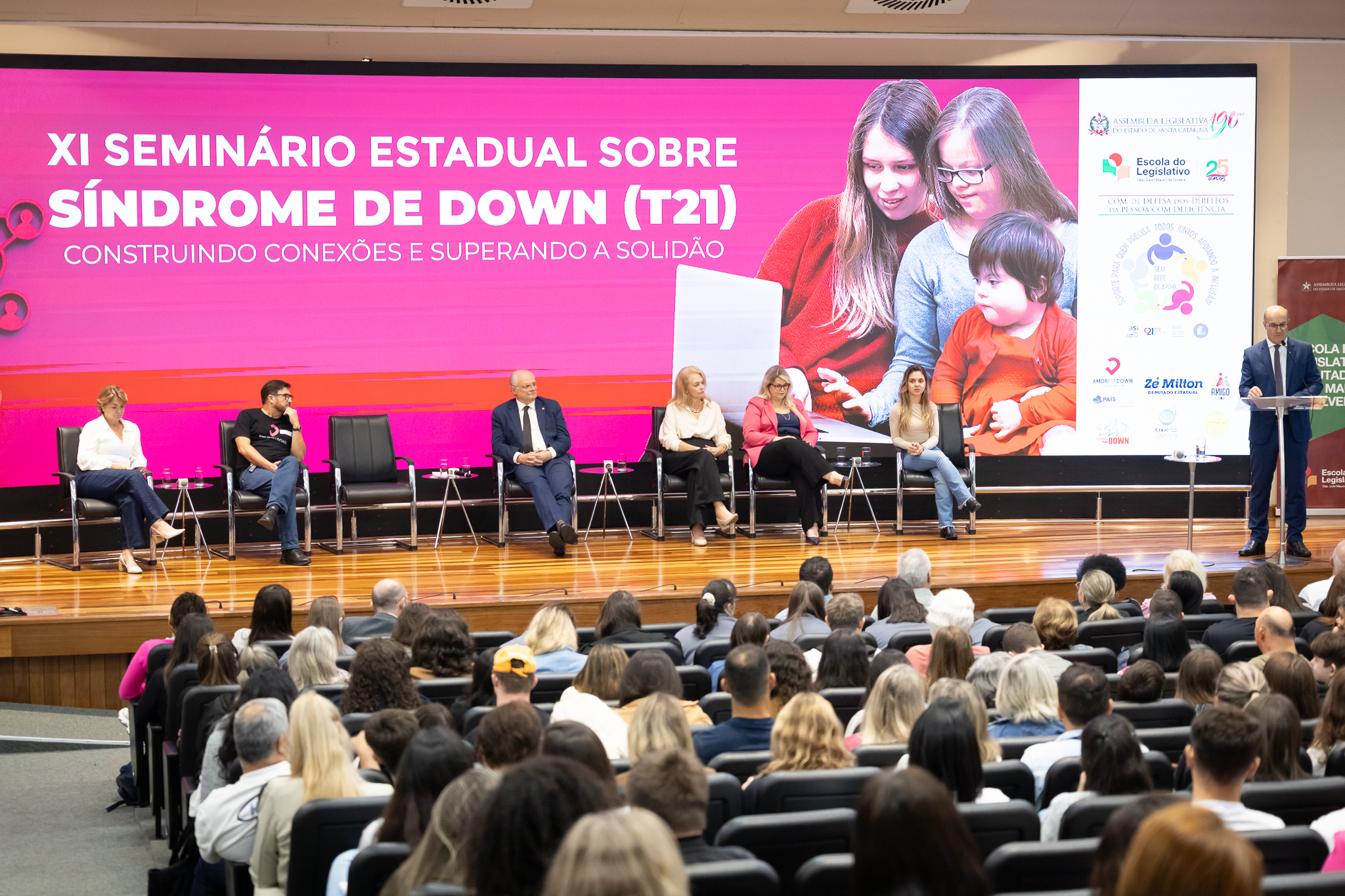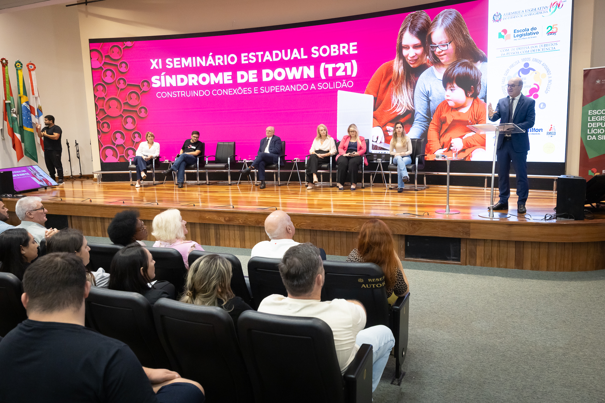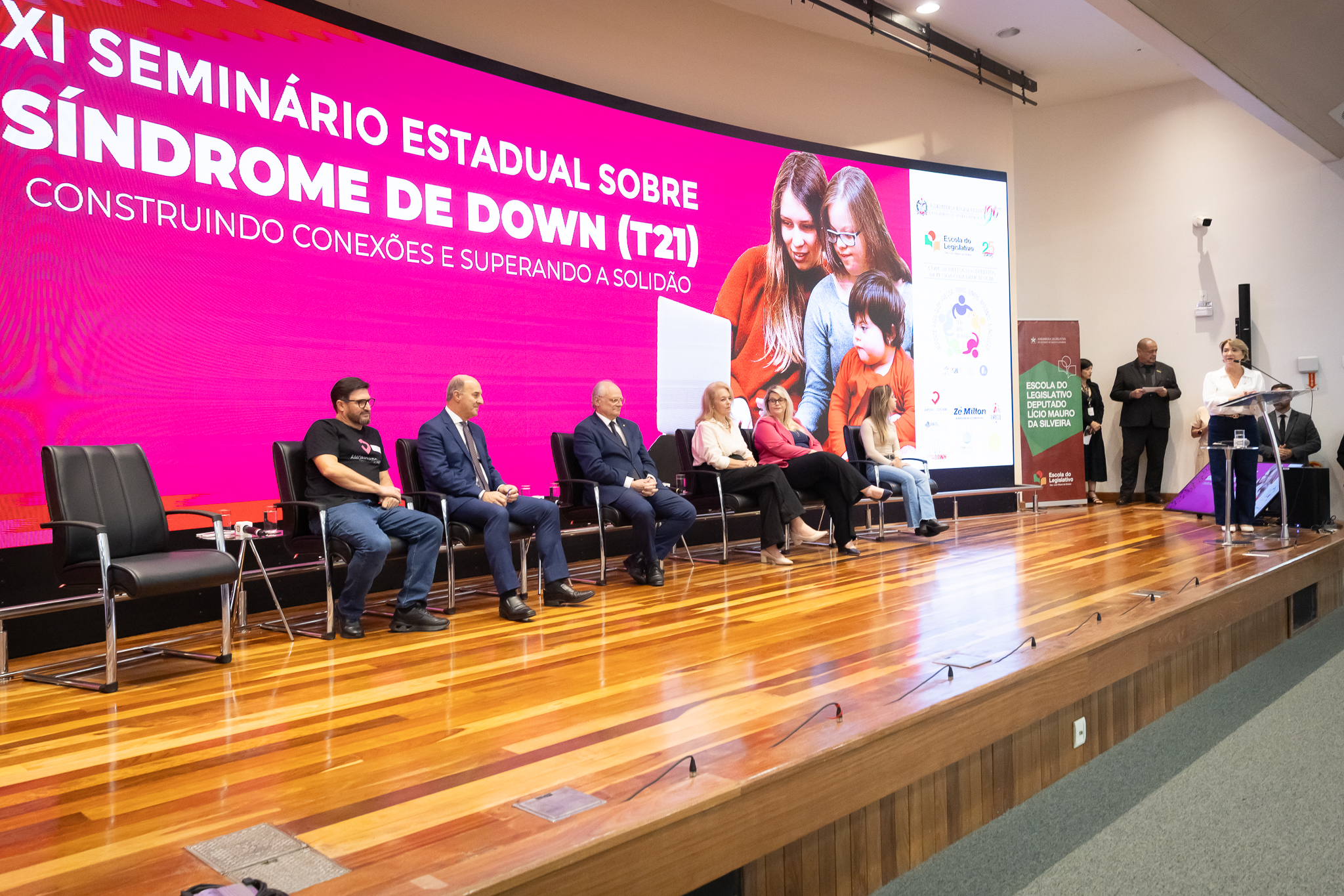 A solenidade de abertura contou com a presença do presidente da Comissão dos Direitos da Pessoa com Deficiência, deputado Dr. Vicente Caropreso (União Brasil); do deputado José Milton Scheffer (PP), proponente do seminário; da presidente da Federação Catarinense de Educação Especial, Jeane Rauh Probst Leite; do diretor de projetos das Associações de Síndrome de Down, Marco Antônio Costa; da representante da Secretaria de Estado da Saúde, Jaqueline Reginato; da vice-presidente da Federação das Apaes de Santa Catarina, Janice Krasniak; e da autodefensora das Apaes, Isabela Macedo de Ávila.